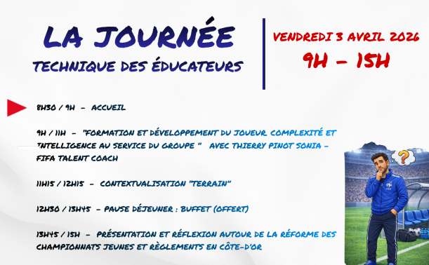 La section formation Arbitre Auxiliaire de la CDA organise deux ultimes session d'Examen et Recyclage 2025-2026. JEUDI 12 FEVRIER 2026- A 19H00 - Au Club House du Complexe sportif Paul Dubreuil - Rue Joseph Pesquidoux à Savigny les Beaune. SAMEDI 14 FEVRIER 2026 A 9H00 au siège du ...