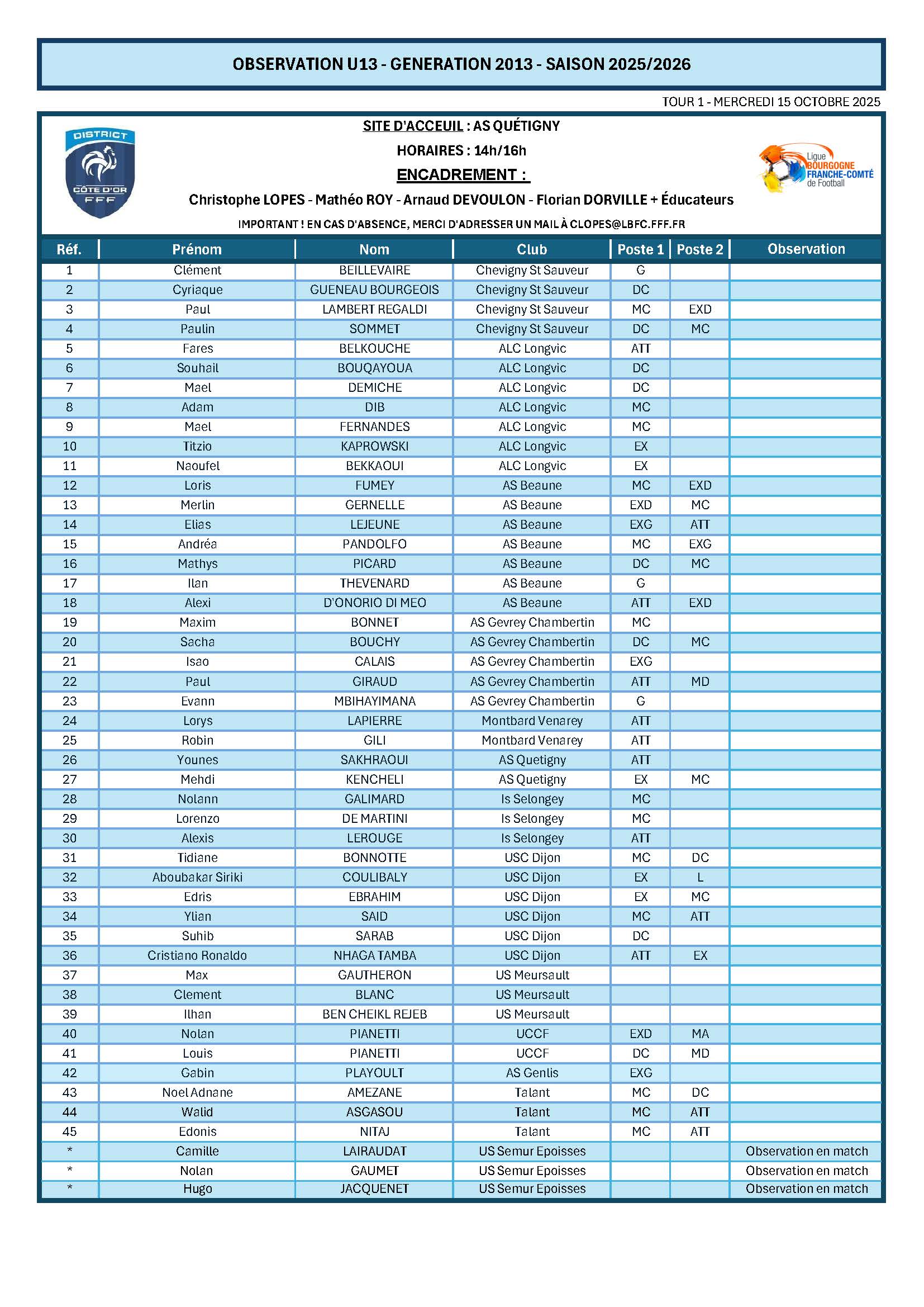 Personne à contacter en cas d’absence : M. LOPES Christophe : clopes@lbfc.fff.fr.