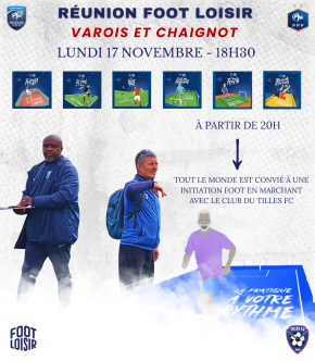 Afin d’accompagner les clubs dans leurs projets, nous vous invitons à une réunion d’information dédiée à la création et au développement des sections Loisirs qui aura lieu le lundi 17 novembre 2025 à 18h30 sur les installations du TILLES FC à Varois-et-Chaignot.