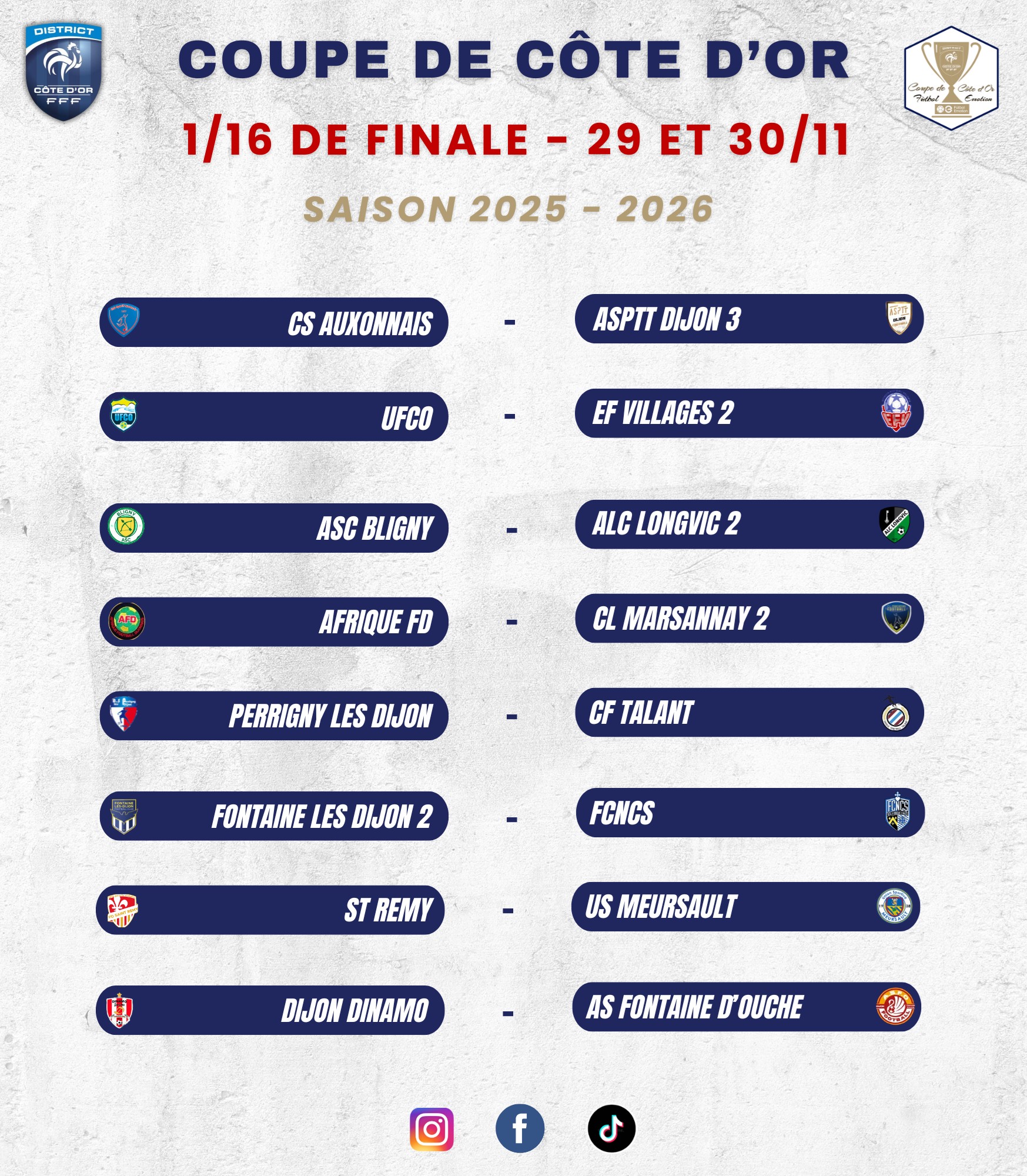 La Commission a procédé aux tirages des 1/16ième de finale des coupes qui auront lieu le 30/11/2025 à 14h30 sur le terrain du club premier nommé.