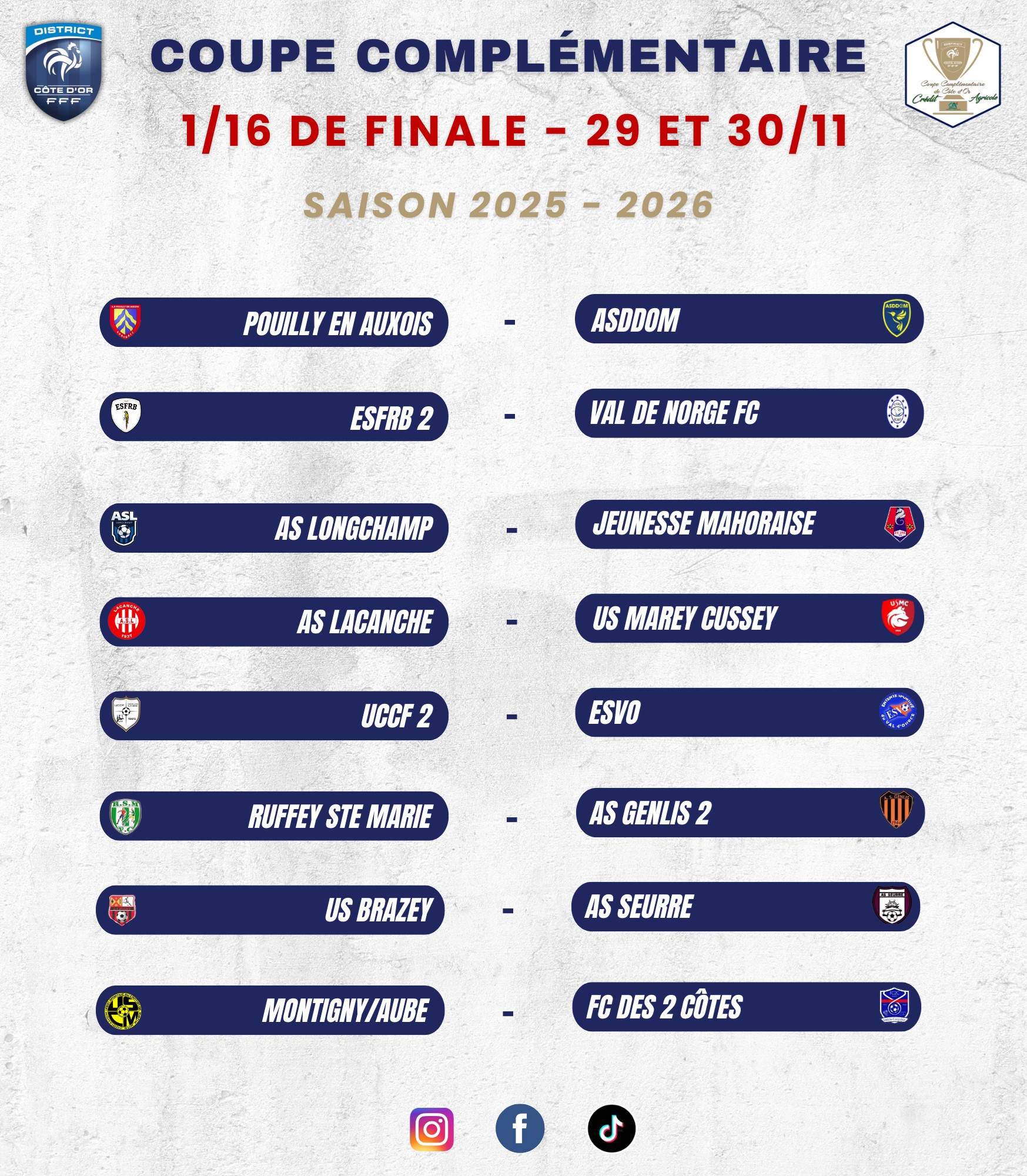 La Commission a procédé aux tirages des 1/16ième de finale des coupes qui auront lieu le 30/11/2025 à 14h30 sur le terrain du club premier nommé.