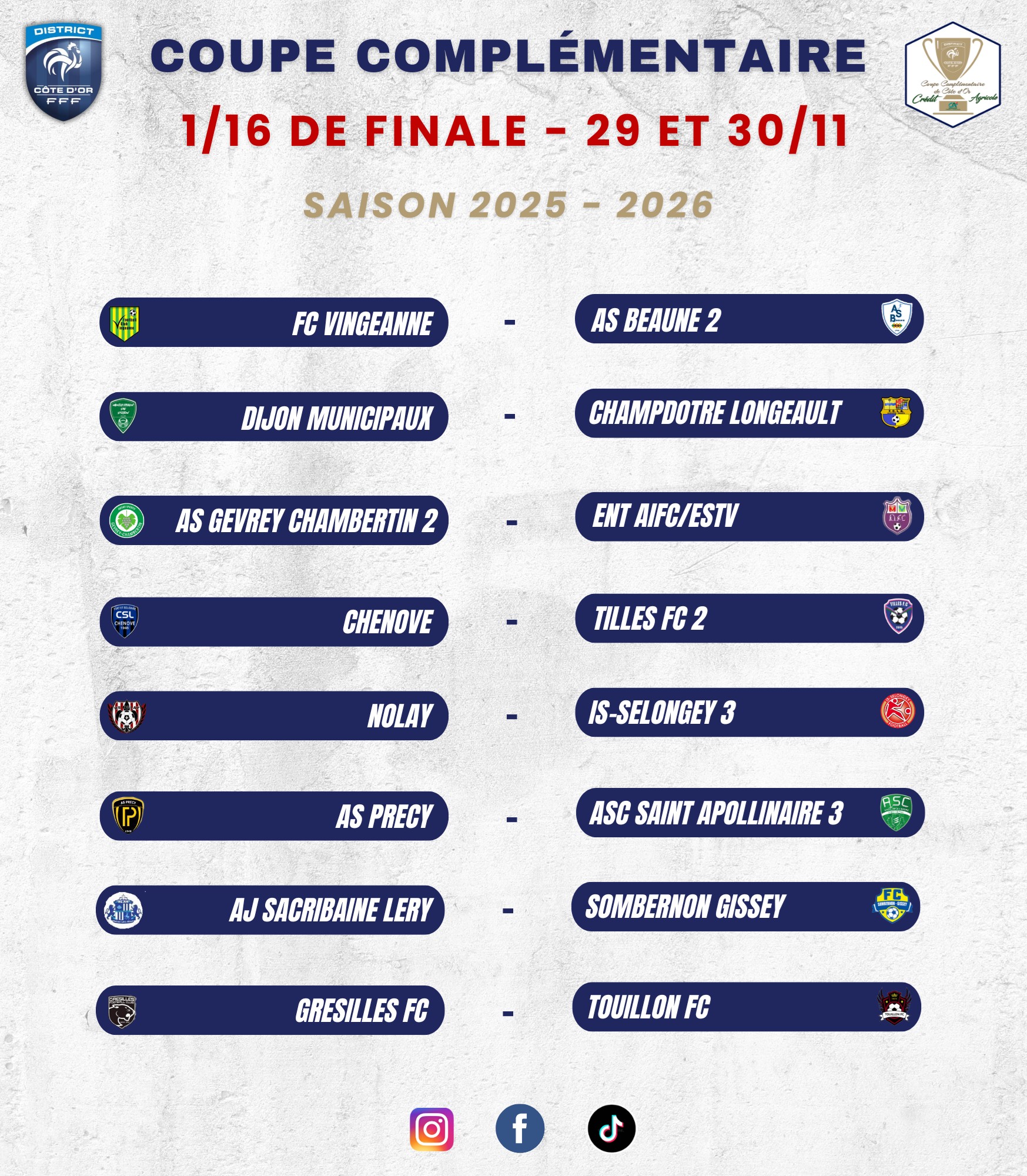 La Commission a procédé aux tirages des 1/16ième de finale des coupes qui auront lieu le 30/11/2025 à 14h30 sur le terrain du club premier nommé.